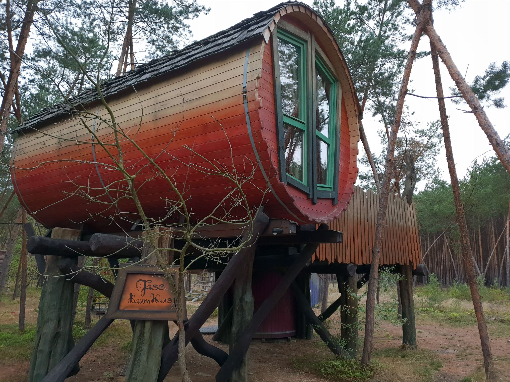 Wir nehmen den Schlüssel in Empfang und parken unser Auto um - denn sehr unweit von unserem Baumhaus gibt es einen weiteren Parkplatz für Übernachtungsgäste und das ist auch gut so, denn sonst müsste man sein Gepäck quer über die Landstraße oder durch den Wald tragen. Einmal um die Ecke, in der Baumkrone versteckt, befindet sich "unser" Baumaquarium - na denn mal rein und das gute Stück ausgiebig betrachten. Dabei wird man zumindest schon mal nicht vom Handy abgelenkt, denn der Empfang bewegt sich zwischen Edge und Null ;), aber immerhin ist das Baumhaus eine hervorragende Pandemie-Behausung - isoliert ist man hier allemal!